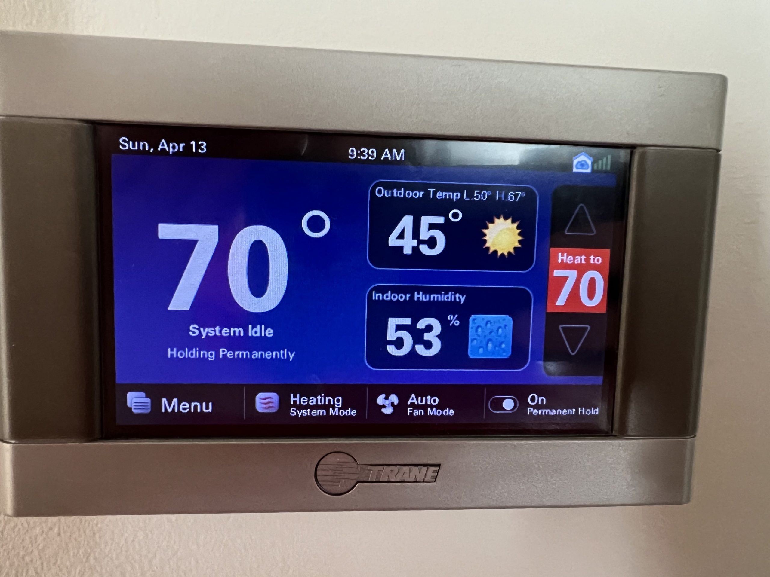 "Upgrade your home comfort with a smart thermostat installation. We can help you choose and install advanced thermostats like the Trane XL824 shown, giving you precise control over your heating and cooling, energy savings, and convenient remote access.